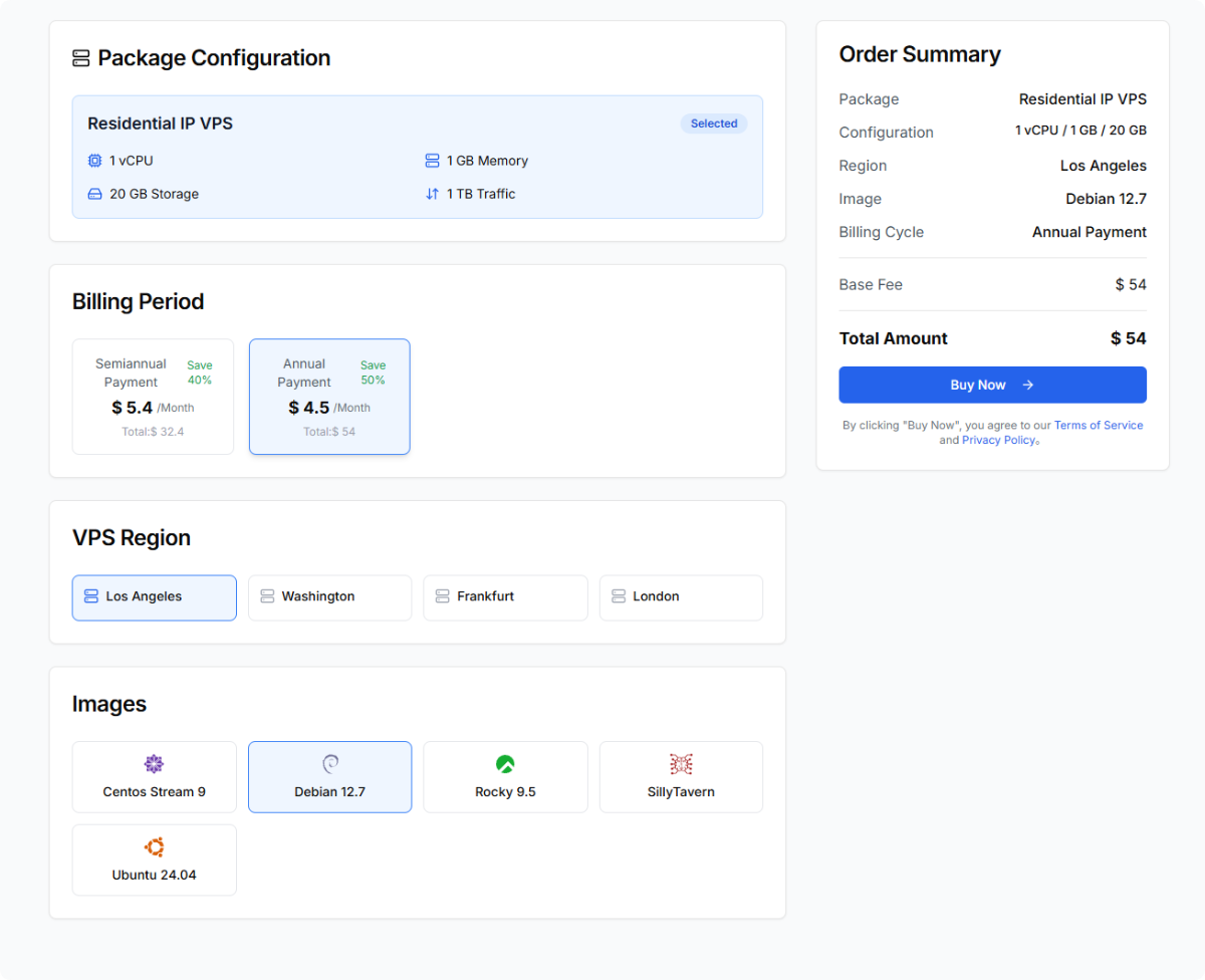 因为落地机只需要看带宽还有流量,在流量使用不是巨量的情况下,最低配置即可,也就是4.5美元一个月足够了。